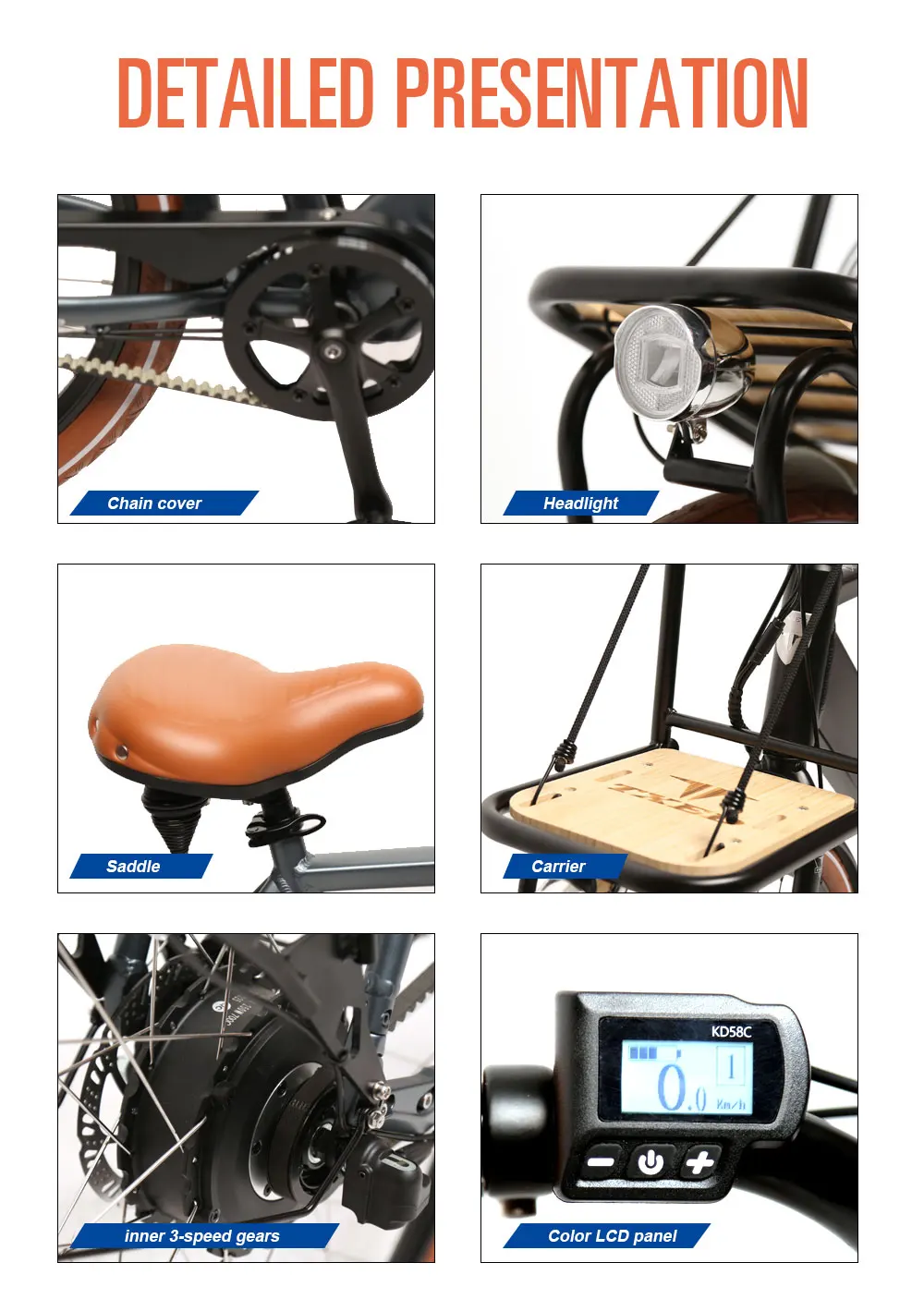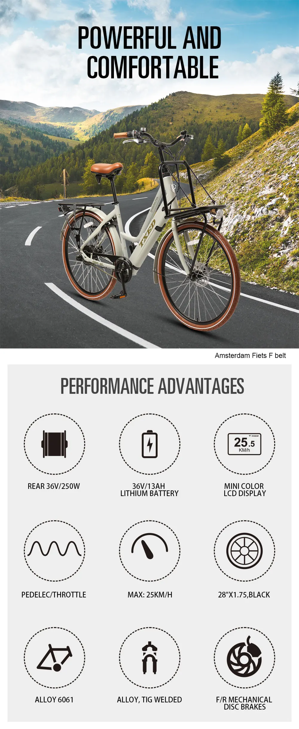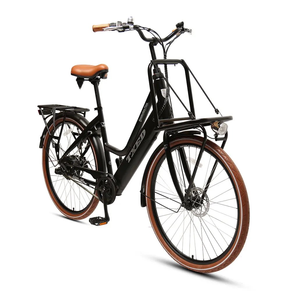 The el Amsterdam Cargo premium is an electric city bike that retains the traditional Dutch characteristics of riding comfort. The swept handlebars keep the rider’s arms relaxed. The super comfortable traditional saddle with double cone-springs makes the rider particularly comfortable.Due to its reinforced front and rear carrier, this bike can carry a lot of heavy cargo, bringing convenience to people’s lives. A steering lock is installed on the head tube, to prevent the bike from losing balance and tipping over when parked, even if some items are placed on the front carrier.This high-end urban electric cargo bike is equipped with hidden batteries, making it look like a simple ordinary bicycle. However, electric power assistance brings joy to riders and the closed chain cover also brings safety and clean..